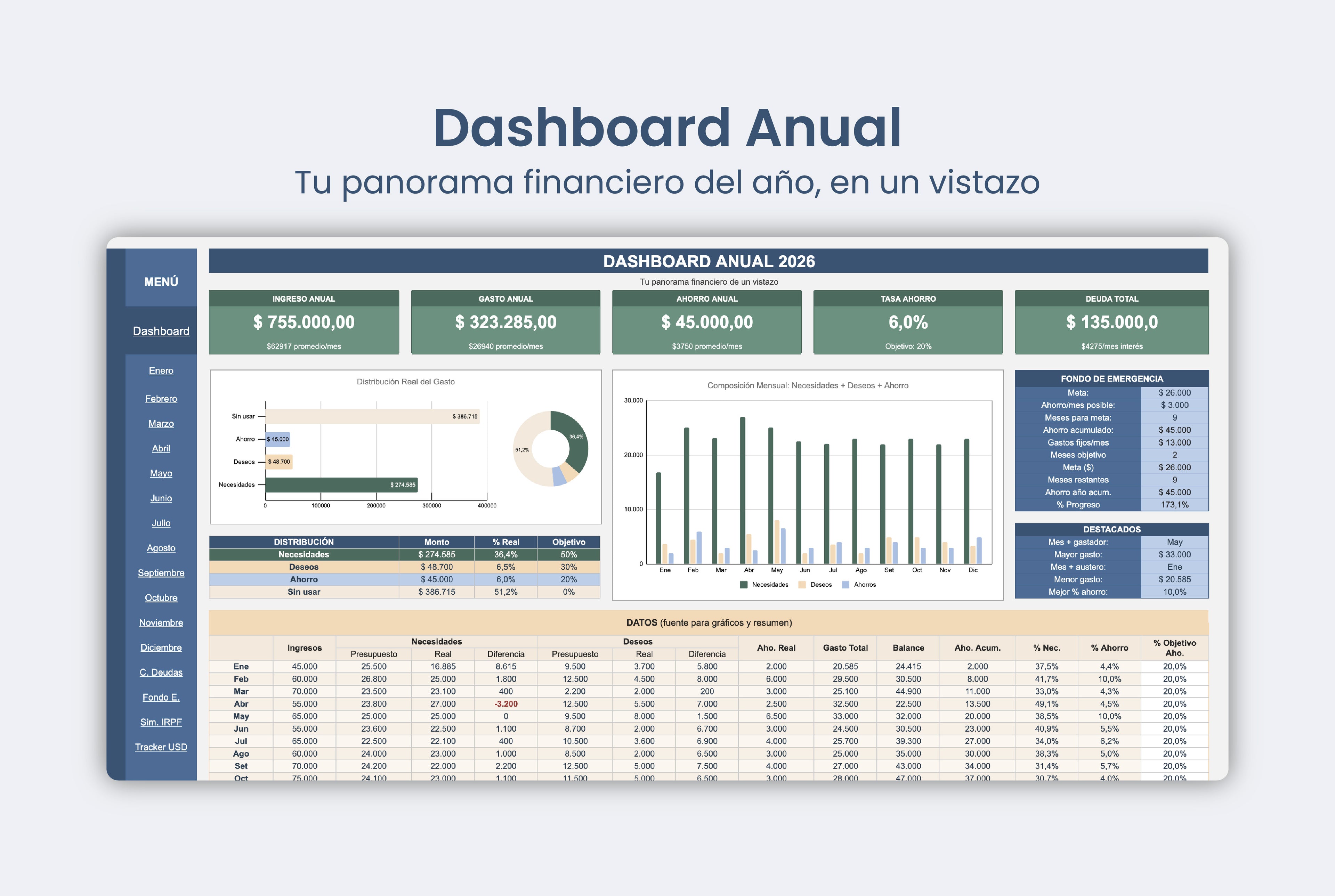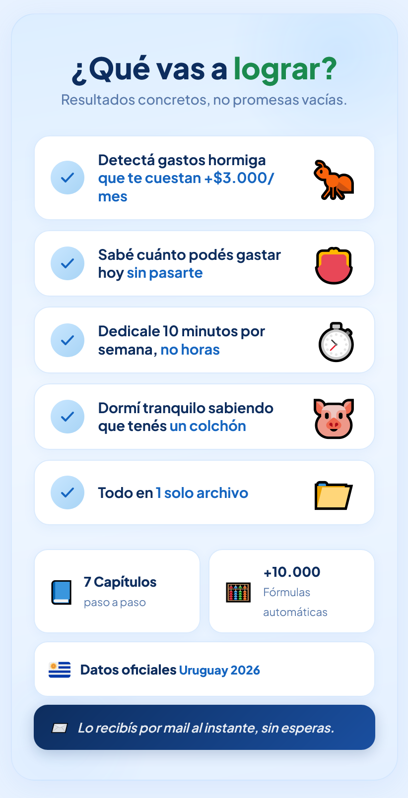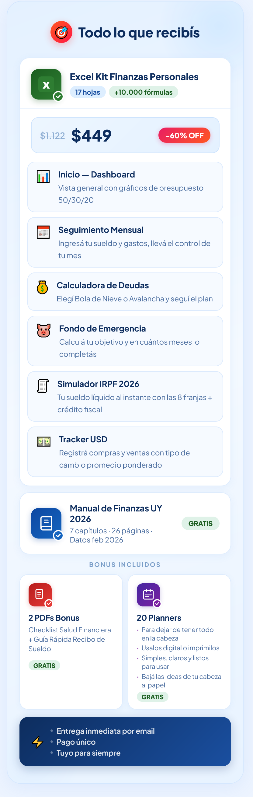 La planilla de presupuesto, deudas y fondo de emergencia funcionan para cualquier país. El Simulador IRPF y el Tracker USD están calibrados con datos uruguayos, pero si vivís en otro lado igual aprovechás el 80% del kit.