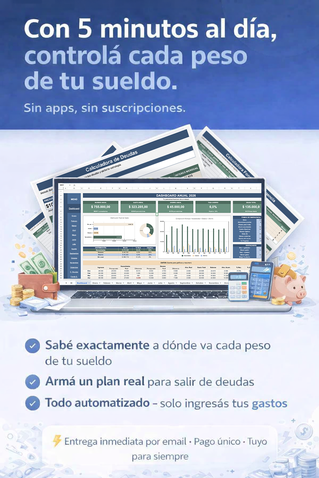 No. Solo tenés que completar las celdas de color con tus datos (sueldo, gastos, deudas) y las +10000 fórmulas calculan todo automáticamente. Además incluye 6 mini videos tutoriales que te guían paso a paso.